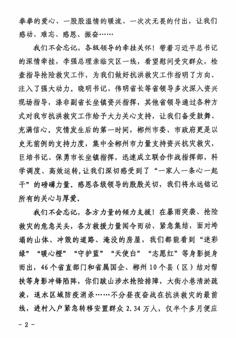 信中指出,資興市此次遭遇災(zāi)情極為罕見,多地基礎(chǔ)設(shè)施遭到嚴(yán)重損毀、大范圍交通中斷,當(dāng)?shù)厝嗣?/span>生產(chǎn)生活遭受嚴(yán)重影響。在關(guān)鍵時刻,湖南交通設(shè)計院黨委高度重視、響應(yīng)號召、極速支援,在黨委書記、董事長向建軍,黨委副書記、副董事長、總經(jīng)理林鳴的部署下,迅速成立救災(zāi)重建工作專班,派出司屬橋梁院、試驗檢測中心、空間信息院、水利環(huán)保部、市政院、規(guī)劃中心、市場中心等單位包括教授級高工在內(nèi)的技術(shù)骨干力量,抽調(diào)設(shè)備物資,全力投入。黨委委員、副總經(jīng)理張重祿赴一線實地調(diào)度,黨委委員、副總經(jīng)理、總工程師李瑜全過程督導(dǎo)。公司上下協(xié)同作戰(zhàn),以實際行動貢獻(xiàn)國企力量,彰顯國企擔(dān)當(dāng)。